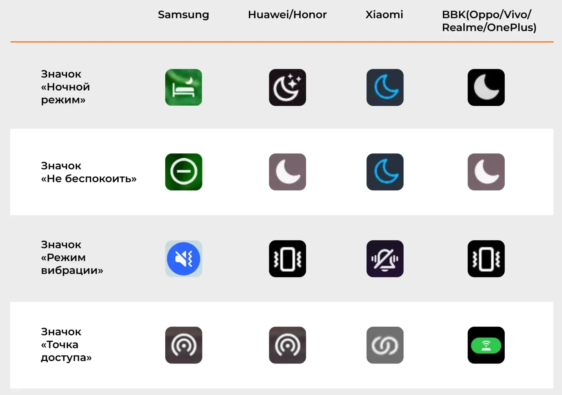 В представленной ниже таблице мы подробно рассмотрим, как выглядят некоторые из этих иконок на устройствах различных брендов.